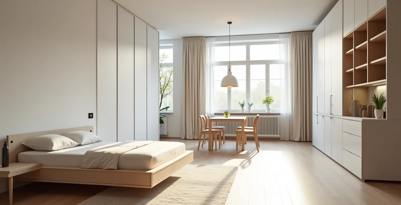 Fünf Funktionen – Schlafen, Arbeiten, Wohnen, Essen, Gäste empfangen – auf 45 m² unterzubringen, klingt nach einer unlösbaren Aufgabe. Der traditionelle Ansatz, jedem Bereich eine feste Ecke zuzuweisen, führt unweigerlich zu Enge und Chaos. Der Schlüssel liegt nicht in starrer räumlicher Trennung, sondern in der Schaffung flexibler Funktionszonen, die sich im Laufe des Tages überlappen und verändern können. Ihr Wohnzimmer von 20 Uhr ist nicht dasselbe wie Ihr Arbeitsplatz von 10 Uhr, auch wenn es sich um dieselbe Fläche handelt.